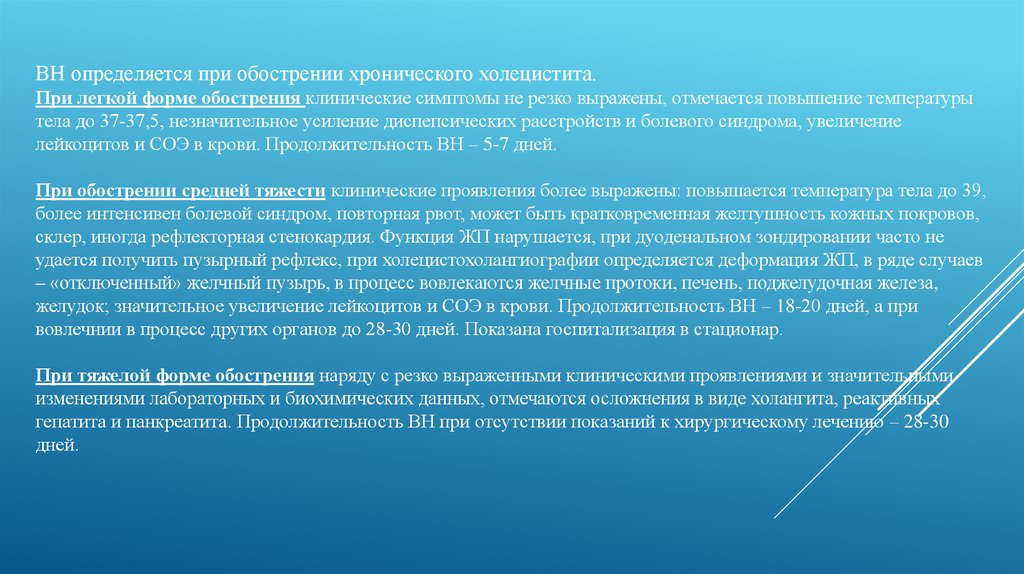 ВН определяется при обострении хронического холецистита.При легкой форме обострения клинические симптомы не резко выражены, отмечается повышение температуры