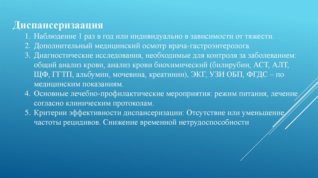 Диспансеризаация1. Наблюдение 1 раз в год или индивидуально в зависимости от тяжести.