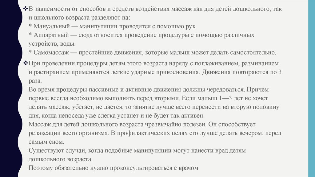 В зависимости от способов и средств воздействия массаж как для детей дошкольного, таки школьного возраста разделяют на: