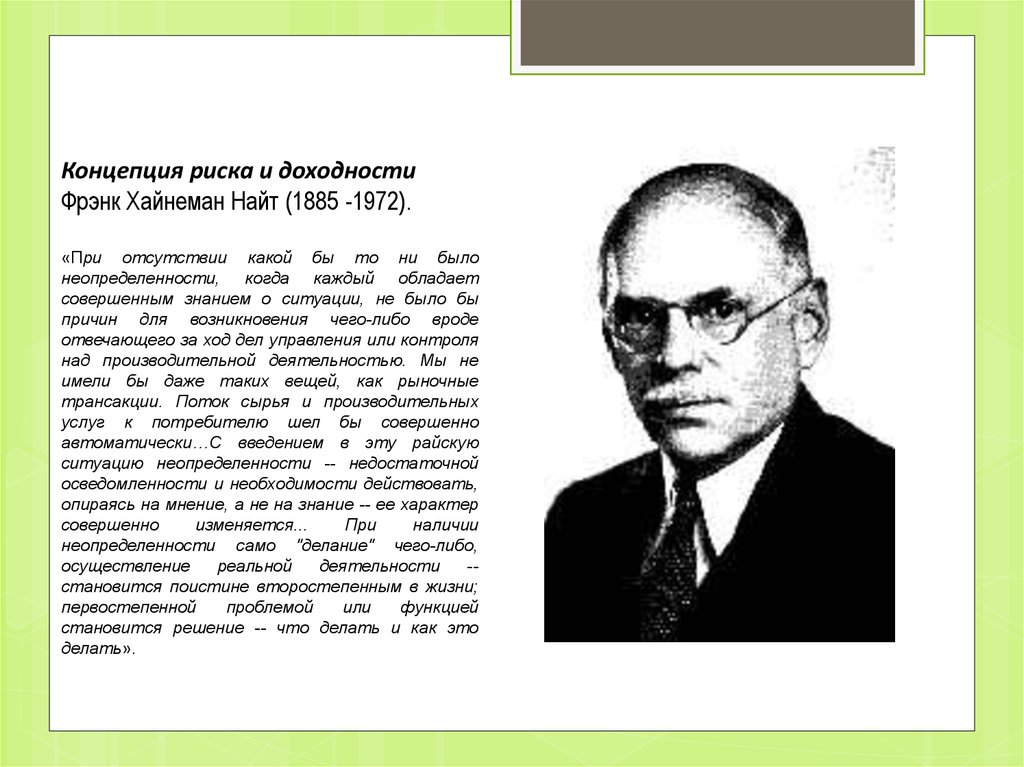 Концепция риска и доходностиФрэнк Хайнеман Найт (1885 -1972).