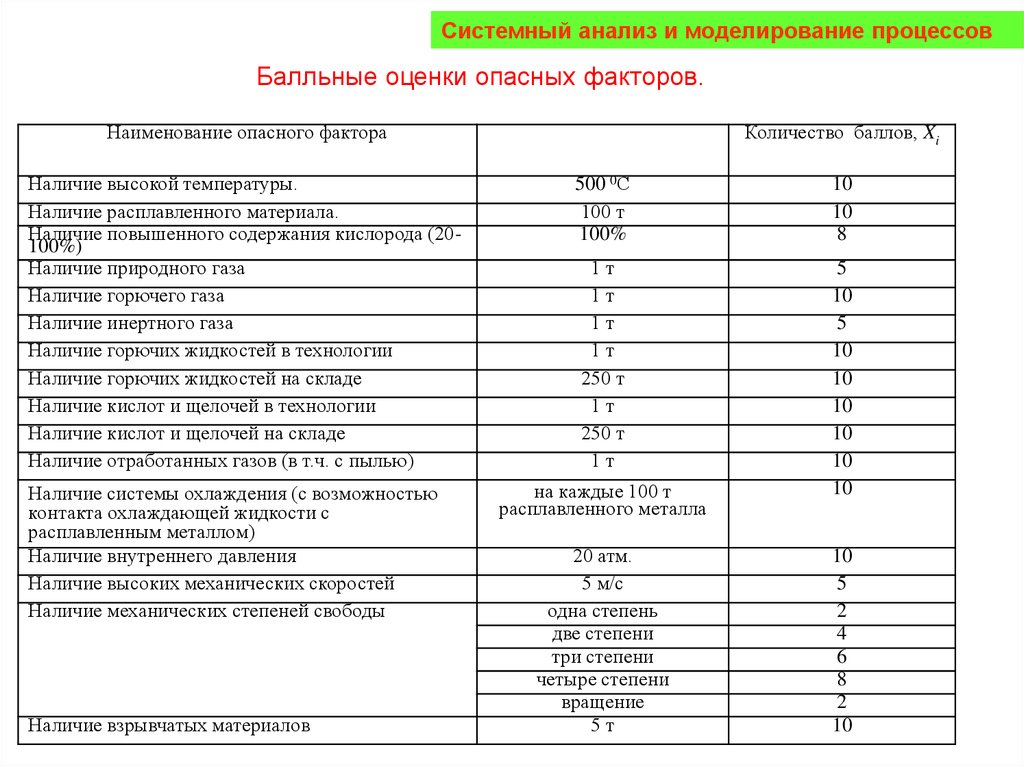 Системный анализ и моделирование процессовБалльные оценки опасных факторов.