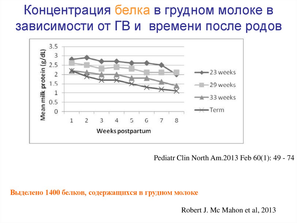 Концентрация белка в грудном молоке взависимости от ГВ и времени после родов