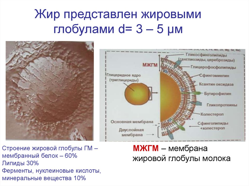 Жир представлен жировымиглобулами d= 3 – 5 μм