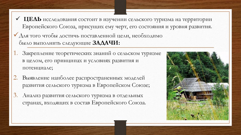 ЦЕЛЬ исследования состоит в изучении сельского туризма на территорииЕвропейского Союза, присущих ему черт, его состояния и уровня развития.