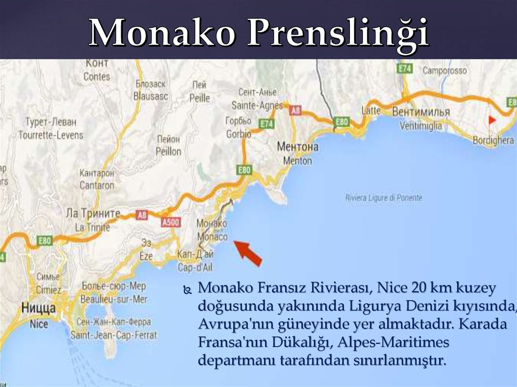 Monako Fransız Rivierası, Nice 20 km kuzeydoğusunda yakınında Ligurya Denizi kıyısında,