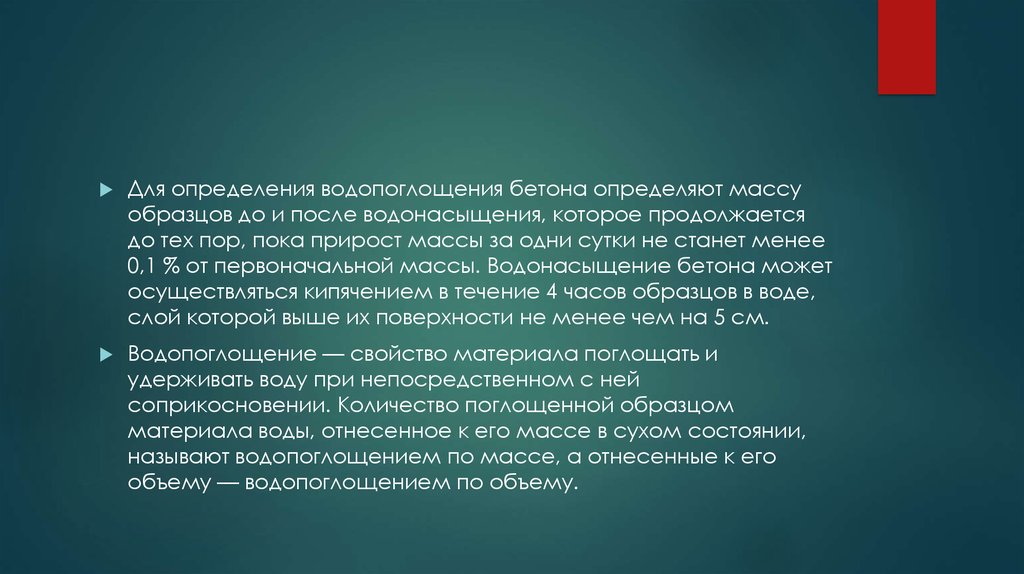 Для определения водопоглощения бетона определяют массуобразцов до и после водонасыщения, которое продолжается