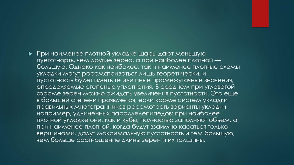 При наименее плотной укладке шары дают меньшуюпуетотнорть, чем другие зерна, а при наиболее плотной —