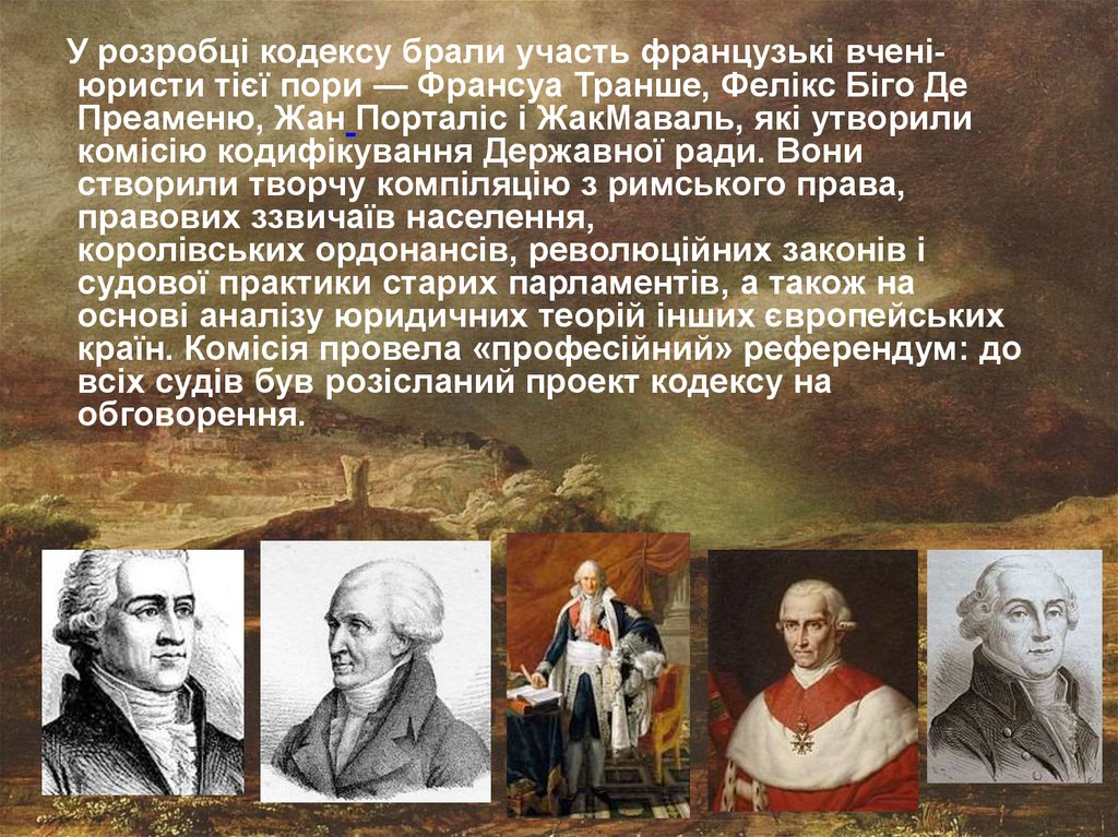 У розробці кодексу брали участь французькі вченіюристи тієї пори — Франсуа Транше, Фелікс Біго ДеПреаменю, Жан Порталіс і ЖакМаваль, які утворили