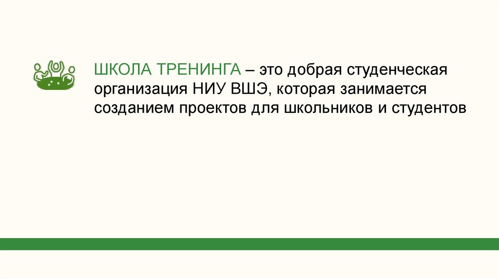 ШКОЛА ТРЕНИНГА – это добрая студенческаяорганизация НИУ ВШЭ, которая занимается
