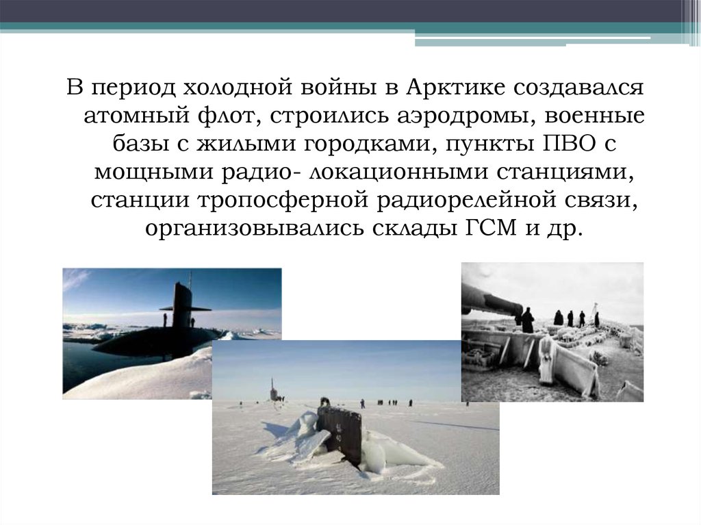 В период холодной войны в Арктике создавалсяатомный флот, строились аэродромы, военные
