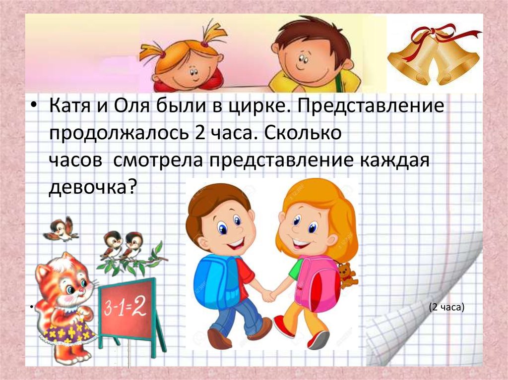 • Катя и Оля были в цирке. Представлениепродолжалось 2 часа. Сколько