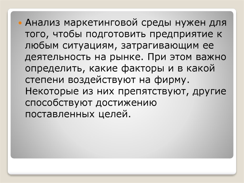 Анализ маркетинговой среды нужен длятого, чтобы подготовить предприятие к
