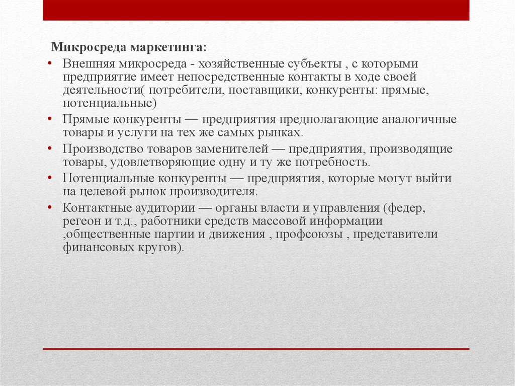 Микросреда маркетинга:• Внешняя микросреда - хозяйственные субъекты , с которыми