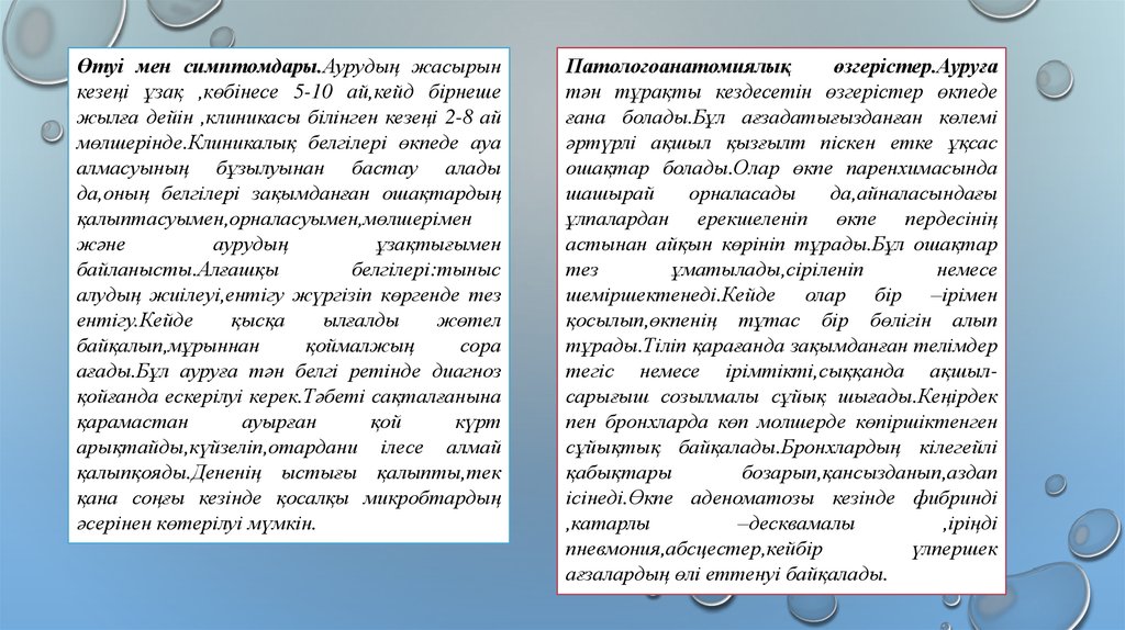 Өтуі мен симптомдары.Аурудың жасырынкезеңі ұзақ ,көбінесе 5-10 ай,кейд бірнеше