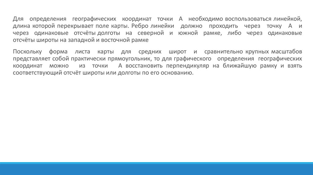 Для определения географических координат точки А необходимо воспользоваться линейкой,длина которой перекрывает поле карты. Ребро линейки должно проходить через точку А и