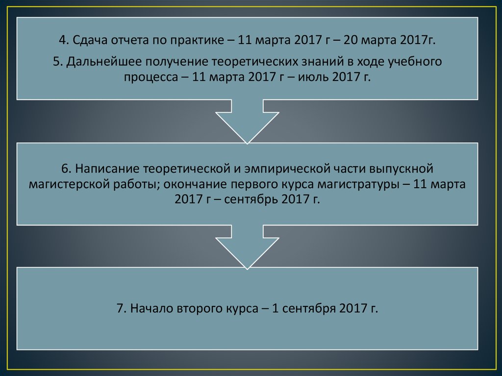 4. Сдача отчета по практике – 11 марта 2017 г – 20 марта 2017г.5. Дальнейшее получение теоретических знаний в ходе учебного