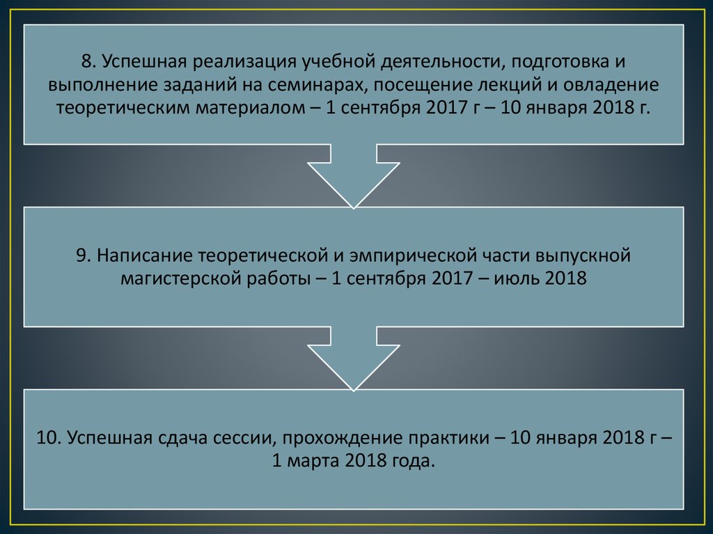 1. Сдача вступительных экзаменов, поступление на первый курсмагистратуры – 3 месяца.