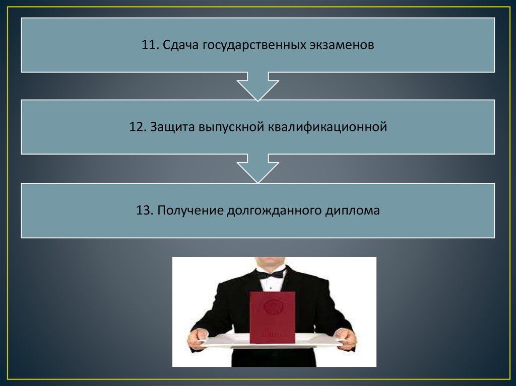 11. Сдача государственных экзаменов12. Защита выпускной квалификационной