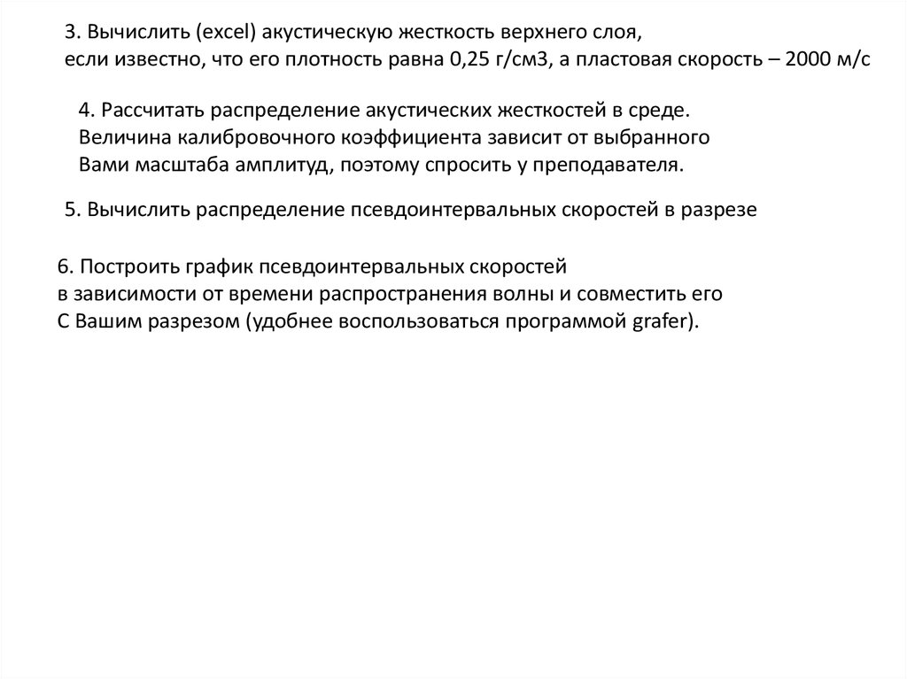 3. Вычислить (еxcel) акустическую жесткость верхнего слоя,если известно, что его плотность равна 0,25 г/см3, а пластовая скорость – 2000 м/с
