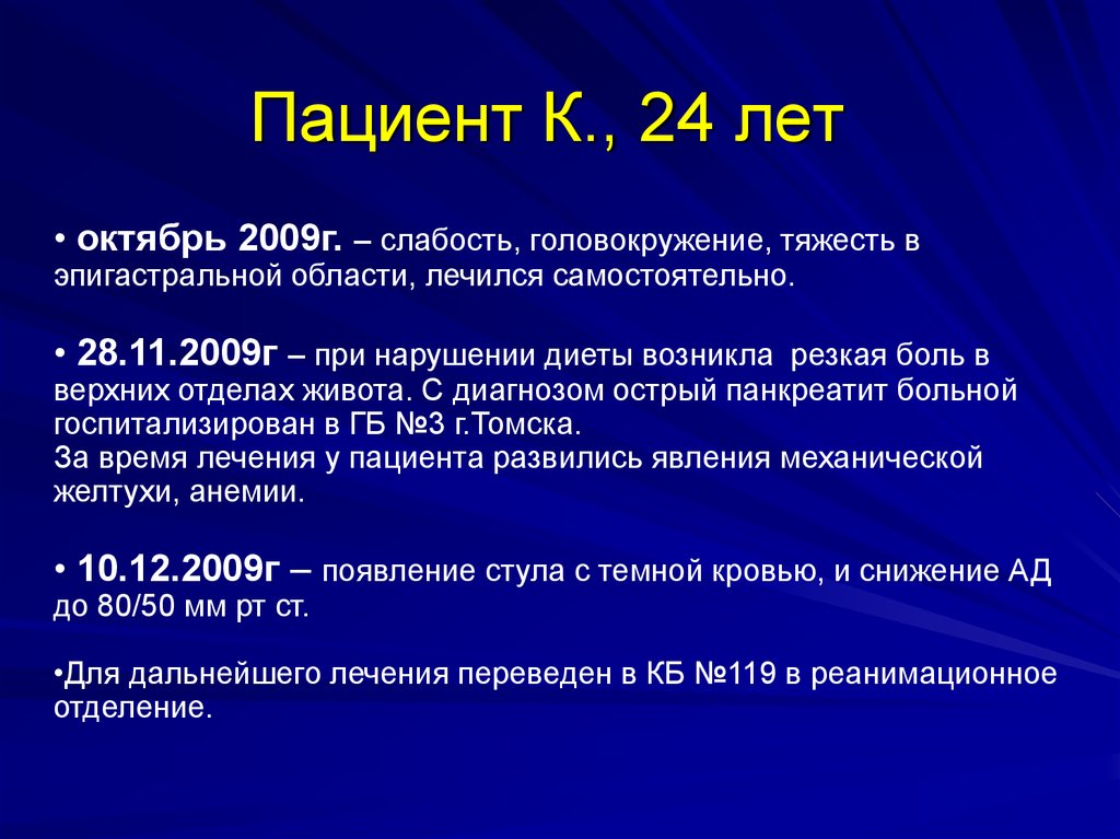 Пациент К., 24 лет• октябрь 2009г. – слабость, головокружение, тяжесть в