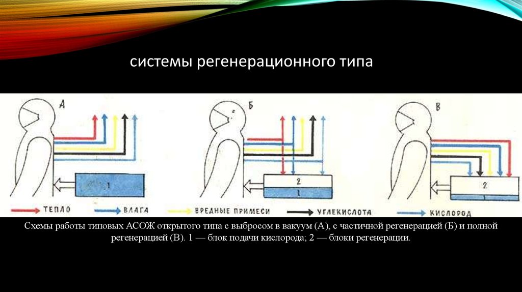системы регенерационного типаСхемы работы типовых АСОЖ открытого типа с выбросом в вакуум (А), с частичной регенерацией (Б) и полной