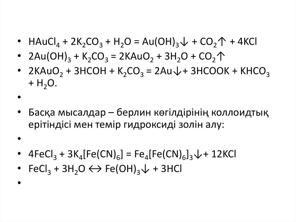 • HAuCl4 + 2K2CO3 + H2O = Au(OH)3↓ + CO2↑ + 4KCl• 2Au(OH)3 + K2CO3 = 2KAuO2 + 3H2O + CO2↑