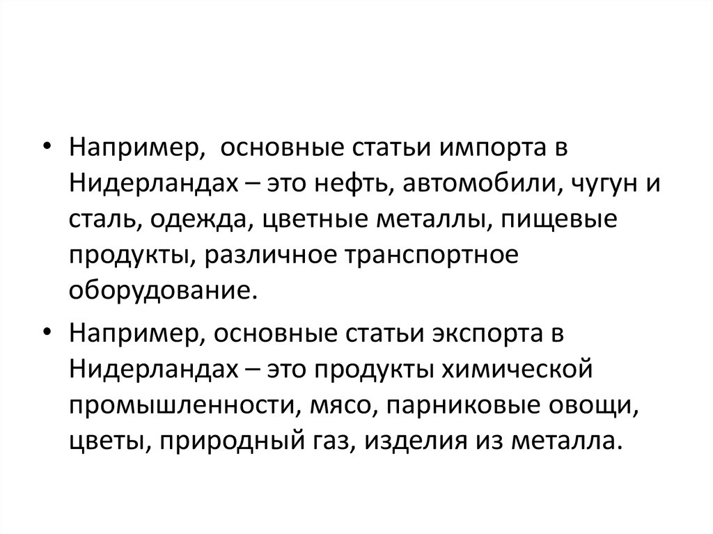 • Например, основные статьи импорта вНидерландах – это нефть, автомобили, чугун и