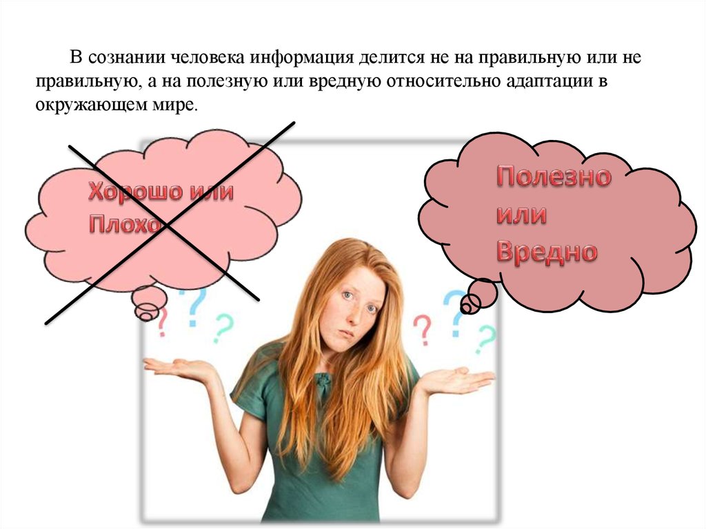 В сознании человека информация делится не на правильную или неправильную, а на полезную или вредную относительно адаптации в