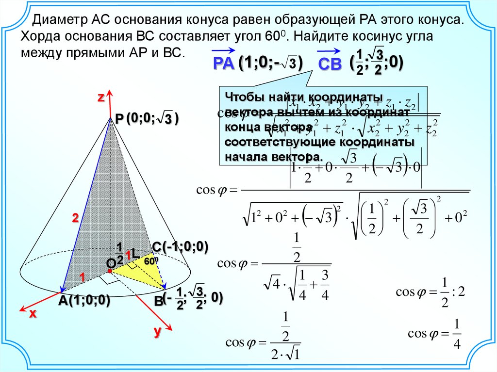 Диаметр АС основания конуса равен образующей РА этого конуса.Хорда основания ВС составляет угол 600. Найдите косинус угла