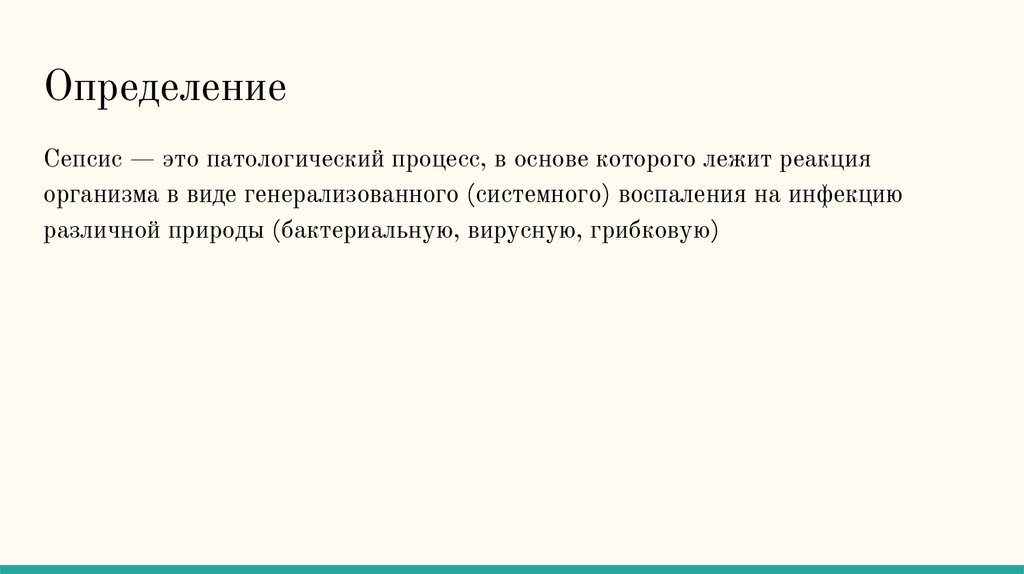 ОпределениеСепсис — это патологический процесс, в основе которого лежит реакция