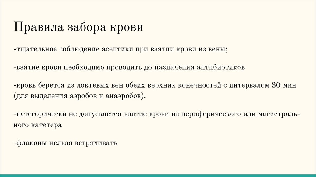 Правила забора крови-тщательное соблюдение асептики при взятии крови из вены;