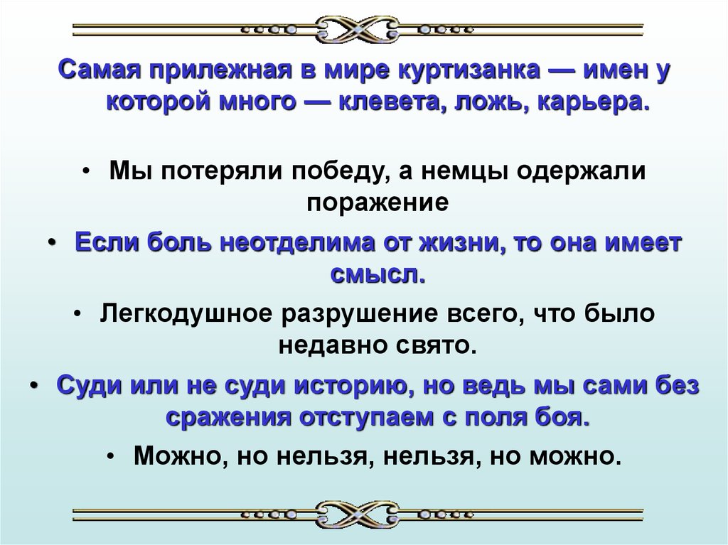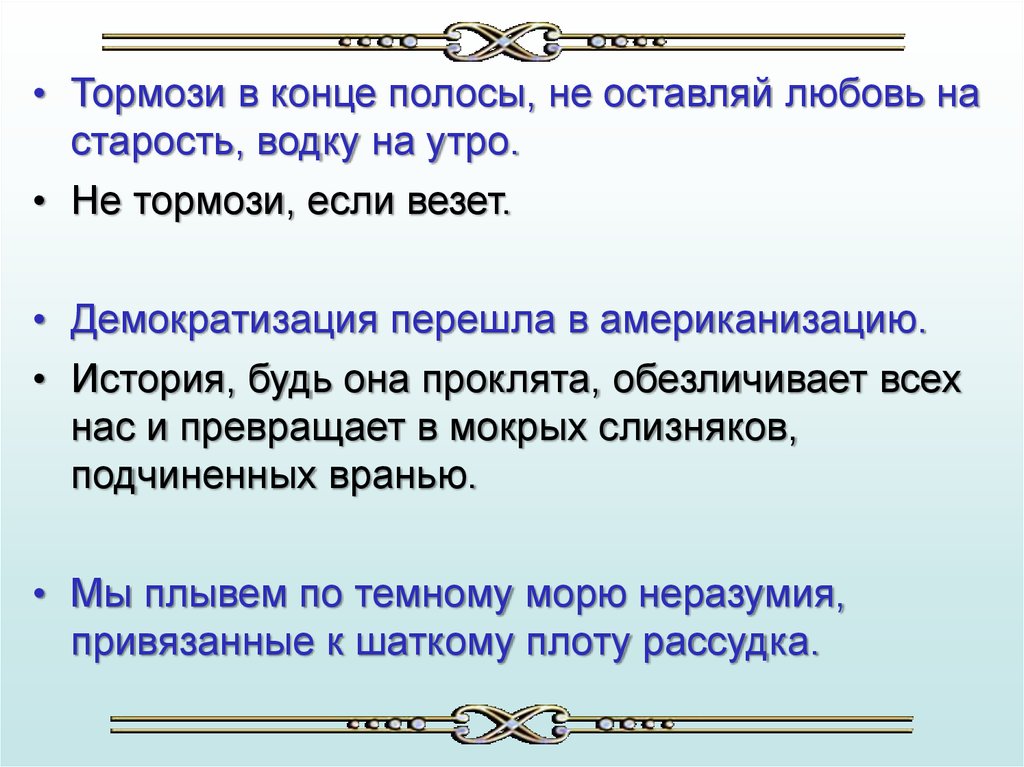 • Тормози в конце полосы, не оставляй любовь настарость, водку на утро.
