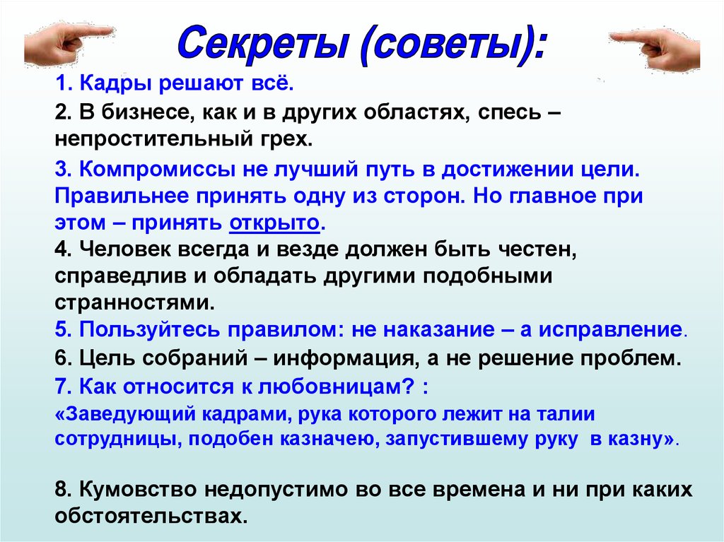 1. Кадры решают всё.2. В бизнесе, как и в других областях, спесь –