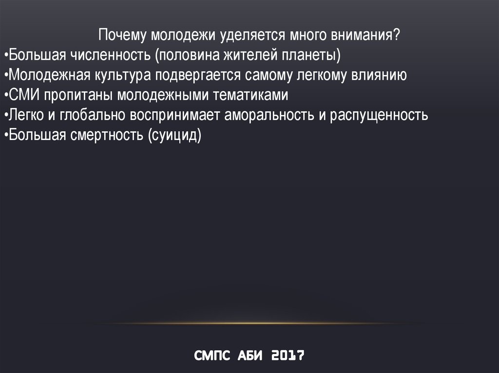 Почему молодежи уделяется много внимания?•Большая численность (половина жителей планеты)