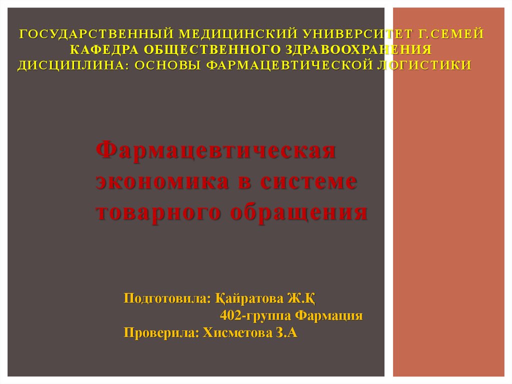 1. ГОСУДАРСТВЕННЫЙ МЕДИЦИНСКИЙ УНИВЕРСИТЕТ г.СЕМЕЙ Кафедра общественного здравоохранения Дисциплина: Основы фармацевтической
