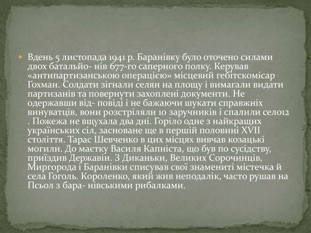 Вдень 5 листопада 1941 р. Баранівку було оточено силамидвох батальйо- нів 677-го саперного полку. Керував
