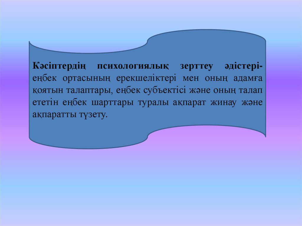 Кәсіптердің психологиялық зерттеу әдістеріеңбек ортасының ерекшеліктері мен оның адамғақоятын талаптары, еңбек субъектісі және оның талап