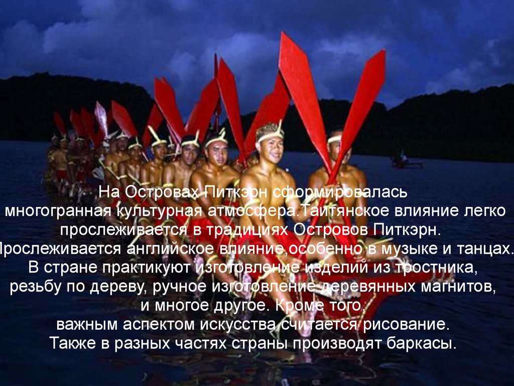 На Островах Питкэрн сформироваласьмногогранная культурная атмосфера.Таитянское влияние легко