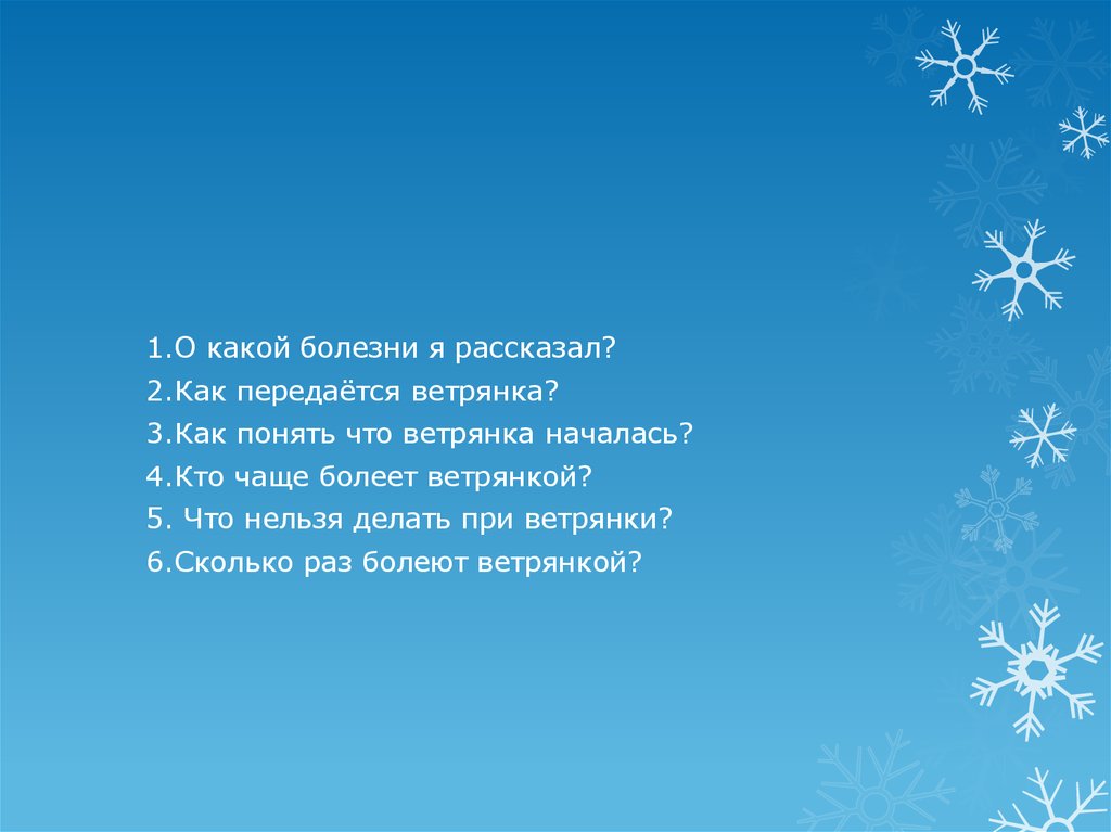 1.О какой болезни я рассказал?2.Как передаётся ветрянка?