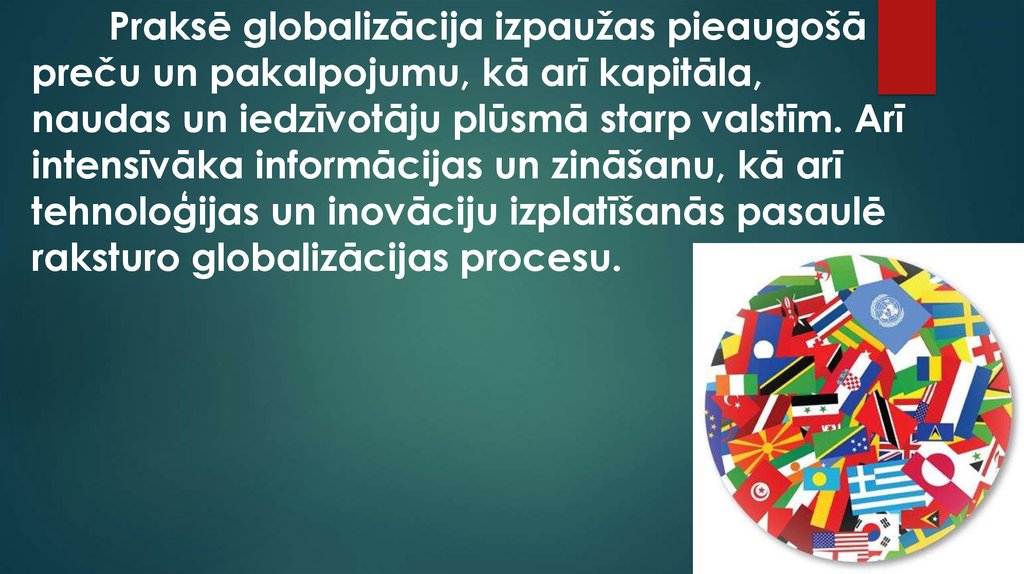 Praksē globalizācija izpaužas pieaugošāpreču un pakalpojumu, kā arī kapitāla,
