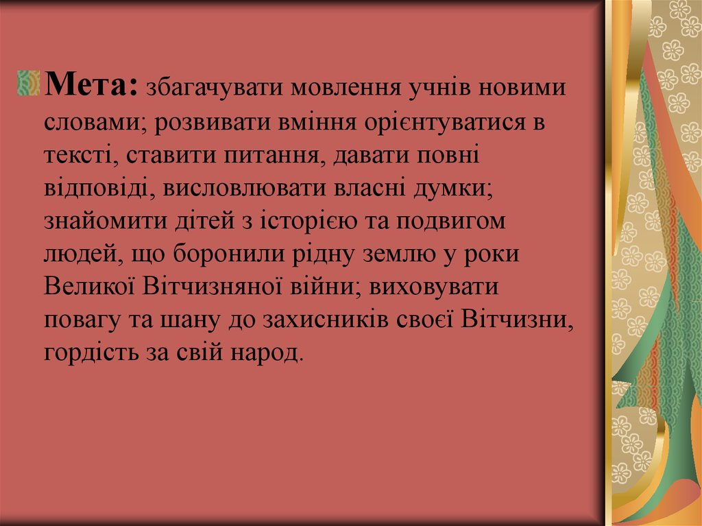 Мета: збагачувати мовлення учнів новимисловами; розвивати вміння орієнтуватися в
