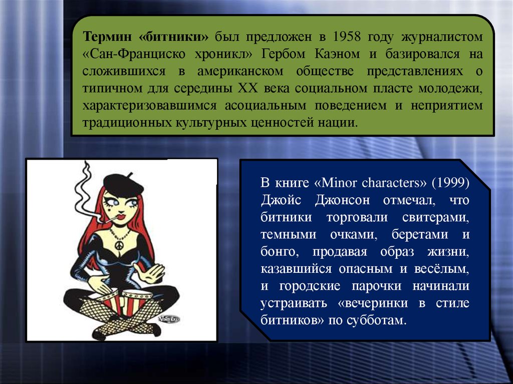 Термин «битники» был предложен в 1958 году журналистом«Сан-Франциско хроникл» Гербом Каэном и базировался на