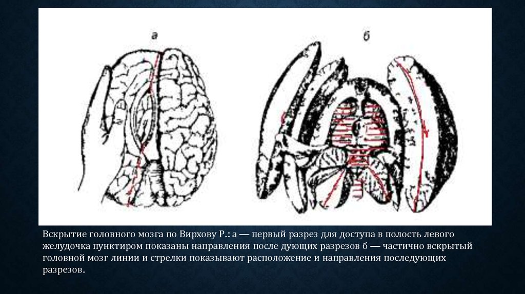 Вскрытие головного мозга по Вирхову Р.: а — первый разрез для доступа в полость левогожелудочка пунктиром показаны направления после дующих разрезов б — частично вскрытый