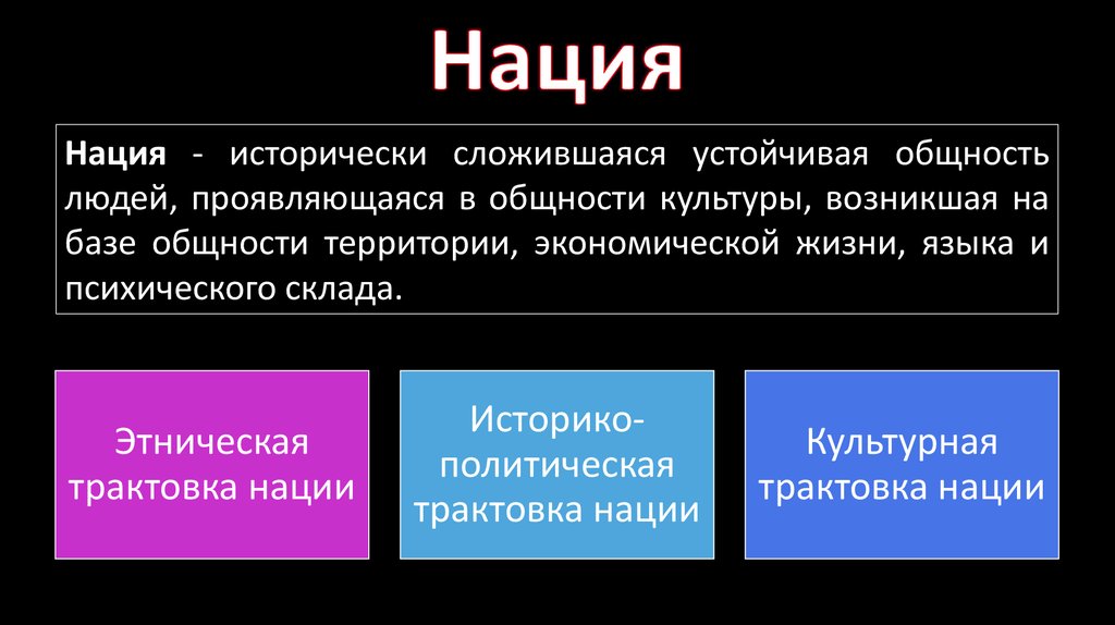 Нация - исторически сложившаяся устойчивая общностьлюдей, проявляющаяся в общности культуры, возникшая на