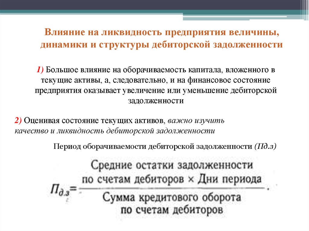 Влияние на ликвидность предприятия величины,динамики и структуры дебиторской задолженности