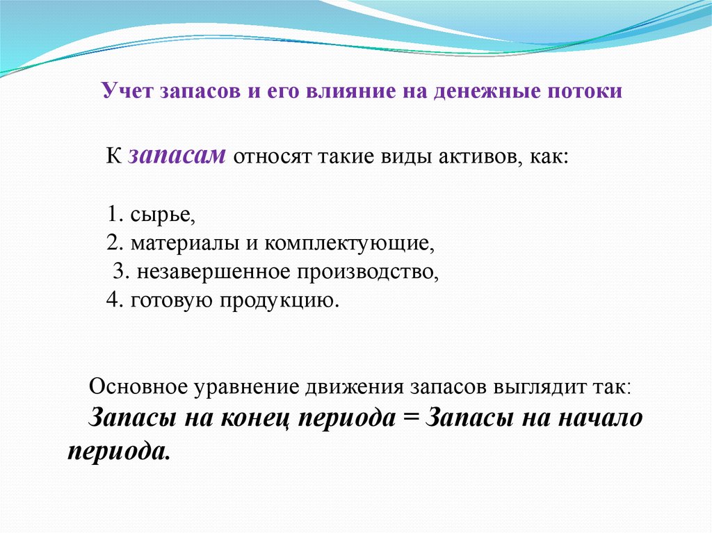 Учет запасов и его влияние на денежные потокиК запасам относят такие виды активов, как:
