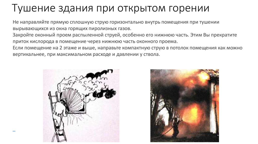 Тушение здания при открытом горенииНе направляйте прямую сплошную струю горизонтально внутрь помещения при тушении