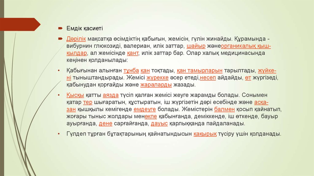 Емдік қасиетіДәрілік мақсатқа өсімдіктің қабығын, жемісін, гүлін жинайды. Құрамында вибурнин глюкозиді, валериан, илік заттар, шайыр жәнеорганикалық қышқылдар, ал жемісінде қант, илік заттар бар. Олар халық медицинасында