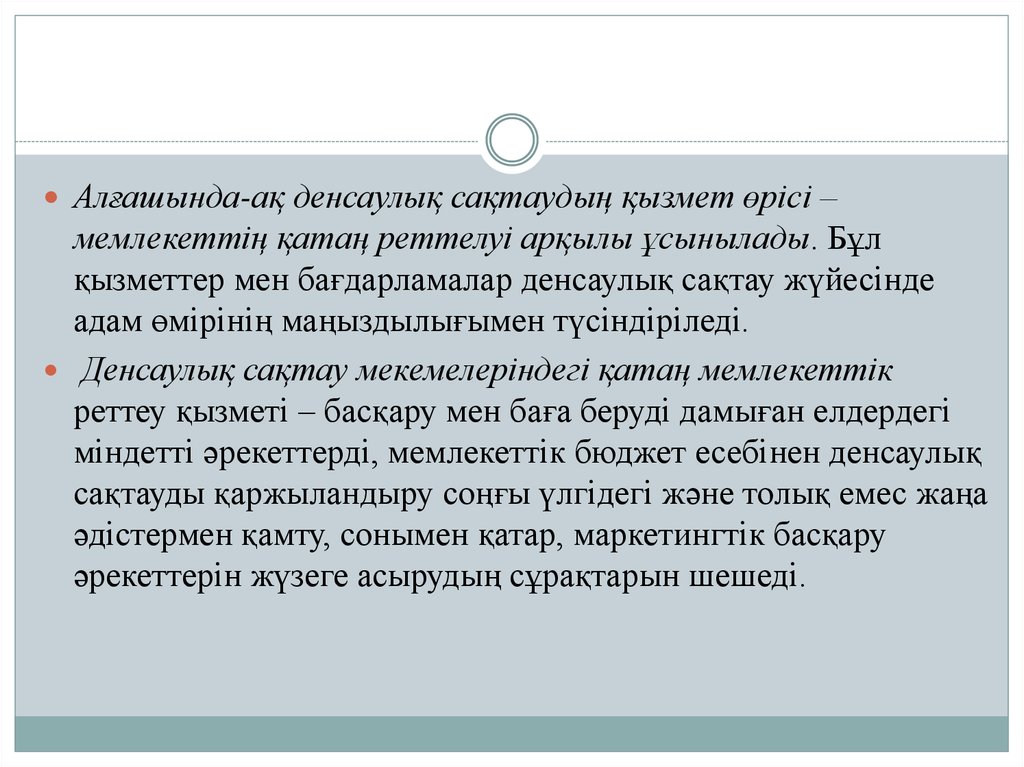 Алғашында-ақ денсаулық сақтаудың қызмет өрісі –мемлекеттің қатаң реттелуі арқылы ұсынылады. Бұл