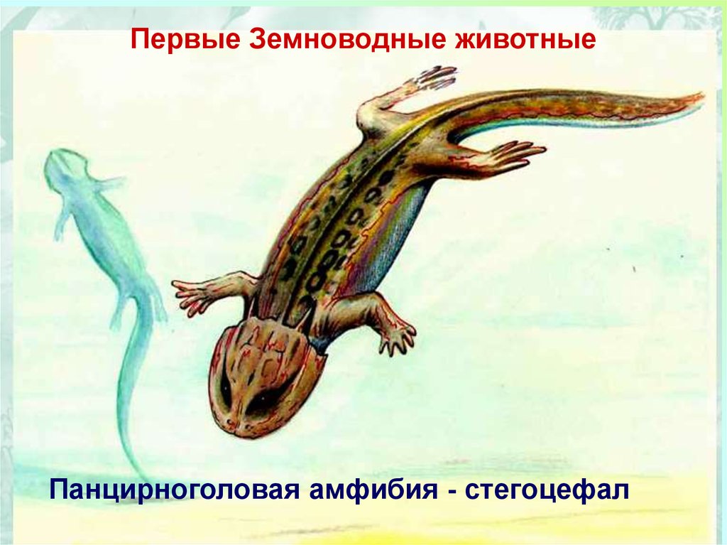 Первые Земноводные животныеПанцирноголовая амфибия - стегоцефал